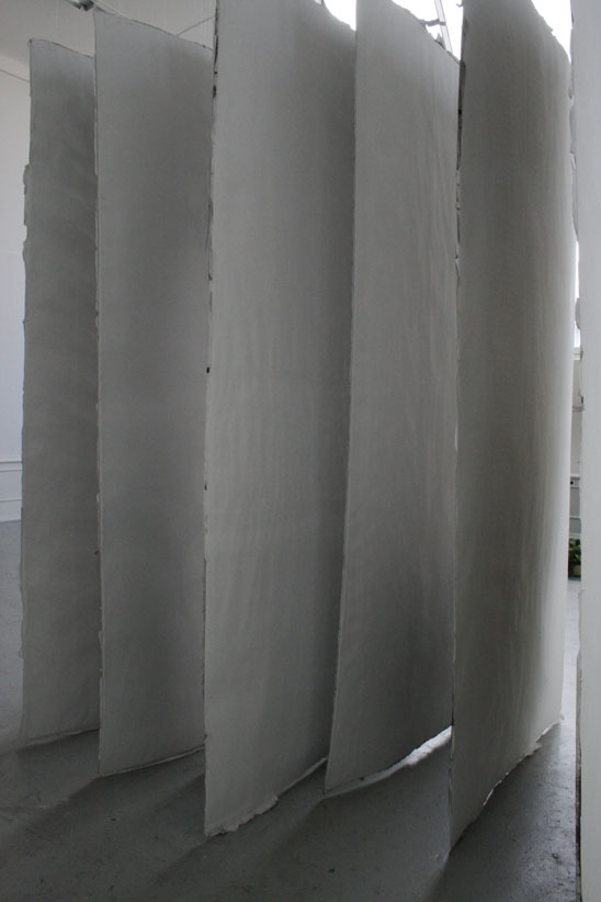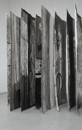– A locked door or a covered window shutting the past is already a great many images. They are transformed when one image lays next to, forces out, sinks into, or satiates another. The wallpaper is is pulled from the walls. A wind sweeps through the abode. Things are embedded. We are in the archives, the wallpaper is ripped from within here. Panorama outpowers overview. It is disjointed in the archive processes and jointed after the form of the archives. This makes possible searches and overview in sequences. The overview is about sequence, the joints have widened, now you put your hand and gaze inside them. When the center of the images have been displaced or lost, gaze and body drift toward the images’ edges. Now the centers are the joints between the water colour objects that conquers one room as another room. A spliced-together monument you can walk around but not enter and cross. A room that offers an overview relying on the illusions of perspective.
