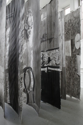 – The invented link between then and now, I don’t expose it fully. The fantasies become images. I enter the room and it is set in motion by the body, and the room at the same time sets the body in motion. It is always so and that alone is a longing. The door to the world that escapes with time is put ajar when images are recycled in a new way, but they drape it and places the past in the future, in another room. Now you see the spliced-together monument, the joints are unsealed, the wind runs through it and the longing is spread. Or back then: The wind rustled among the furniture, a vase was rocked, tipped and was crushed. That’s the most that can happen. Doors are shut, an open window bangs, marking a strange time against the window frame. Flowers and shards float in the spilled water, but when you notice that the wind has already passed toward the outside and the change of air has already come to pass. The smell of flowers doesn’t die away, it shifts, getting stronger or thins out. You said something about unrest and unrest dwells in longing, not in sorrow. With such a longing I wanted to return and reanimate the room. The frame was there, carrying the dwelling of history writing. Drywall, insulation, plumbing, construction. Layer on layer. So it could begin and go on. So it does begin and goes on.