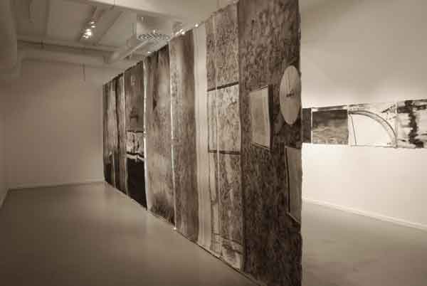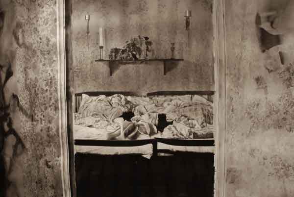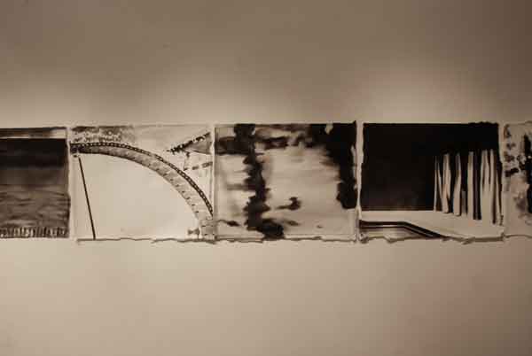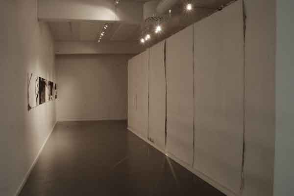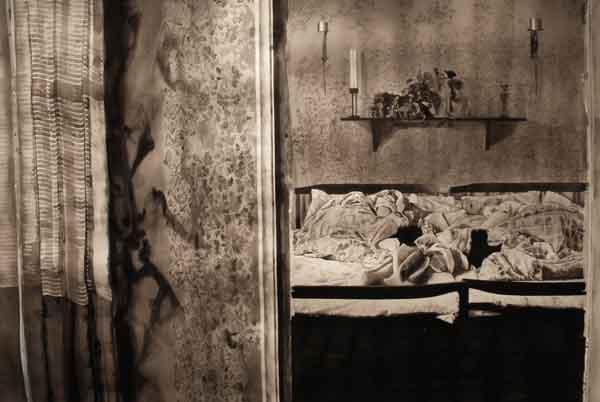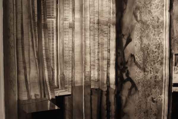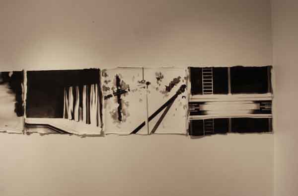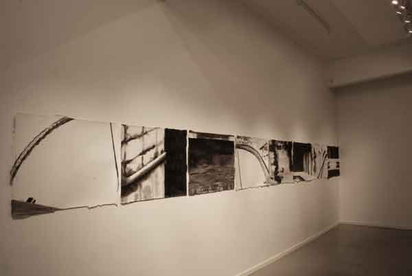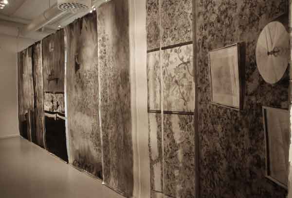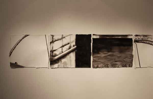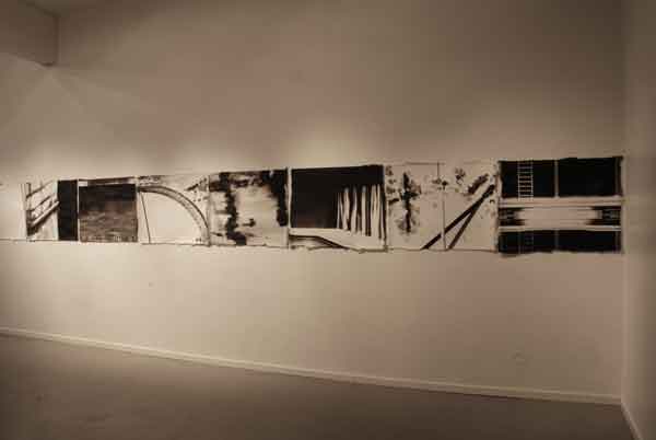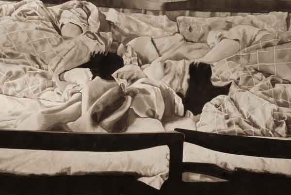 Målningarna bildar tillsammans en vägg som skär genom utställningsrummet, en papperskuliss som skjutits in och vars akvarelltejp skrapar mot golvet. Men framsidan vänder sig från betraktaren och passagen mellan rummets vägg och målningarnas motiv tillåter inte betraktaren att kliva tillbaka och få en överblick. Istället öppnar verket för ett betraktande där enskilda avsnitt avtäcks, interiörer som tar form eller löses upp. Skarvarna mellan målningarna är på samma gång skarpa och överlappande. Ett rum öppnar sig mot ett annat, blicken lämnar skarven och träffar paret i sängen. En sovrumsinteriör och två kroppar under täcken väntar. Kanske sover de, kanske är det en drömlös sömn där ingen skillnad mellan minne och glömska råder?