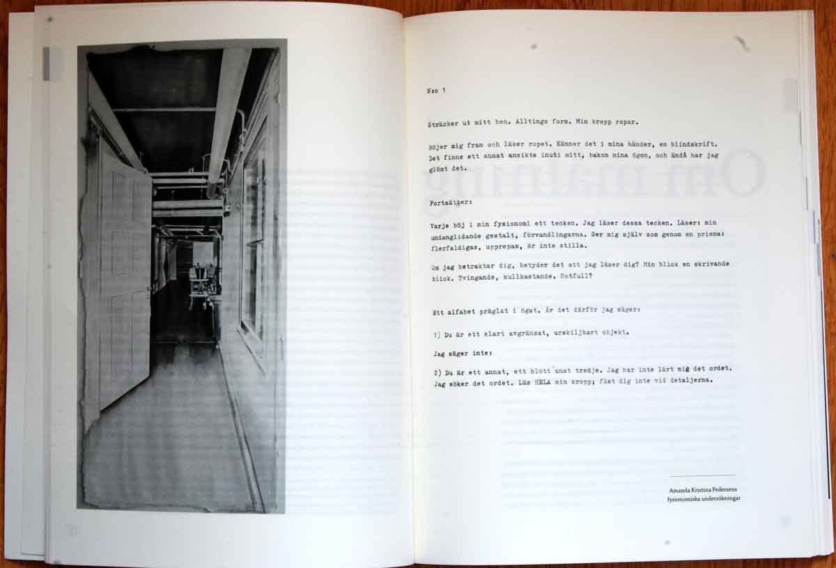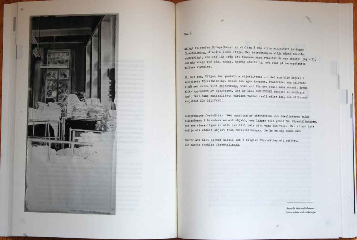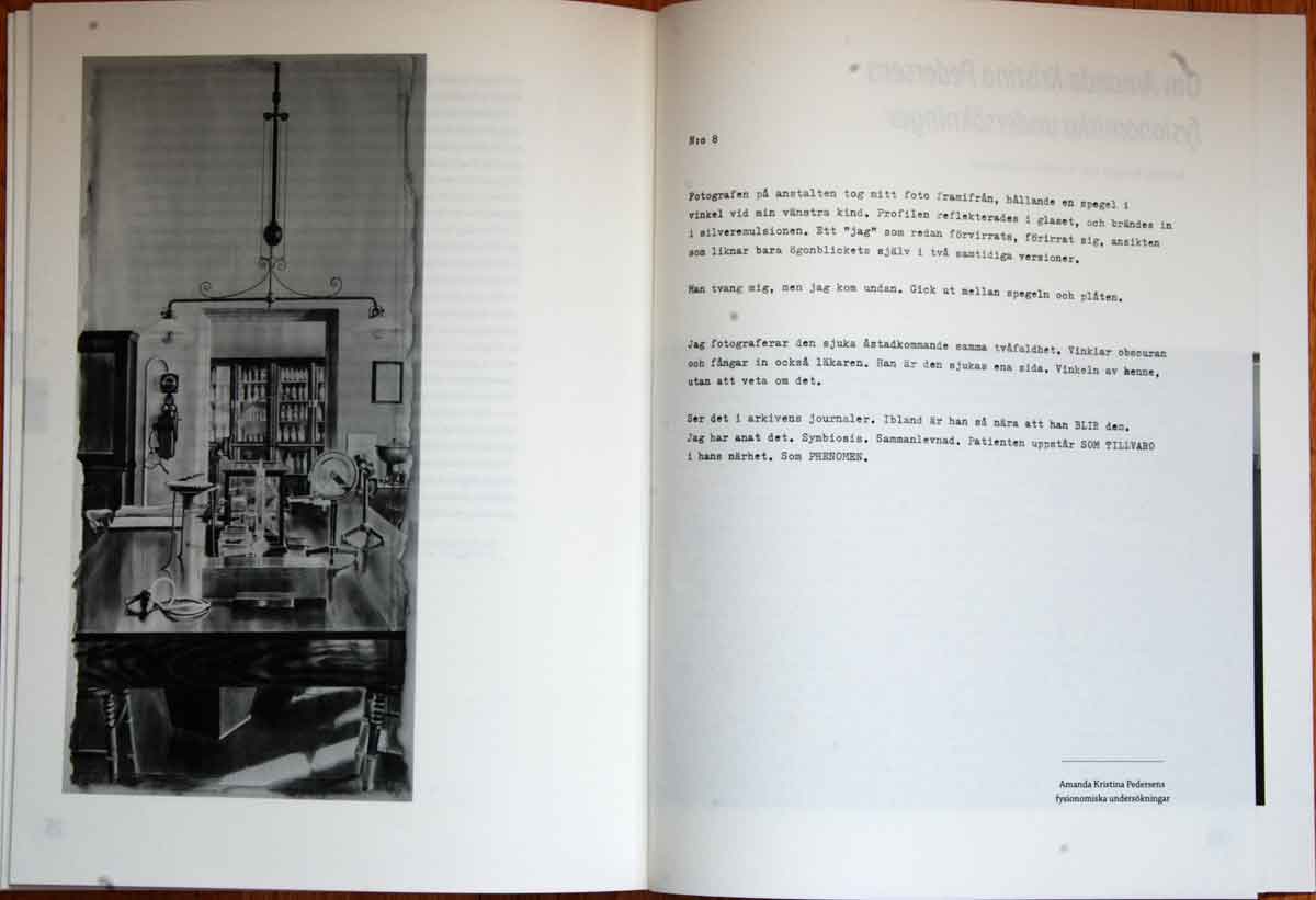 Fotografen på anstalten tog mitt foto framifrån, hållande en spegel i vinkel vid min vänstra kind. Profilen reflekterades i glaset, och brändes in i silveremulsionen. Ett ”jag” som redan förvirrats, förirrat sig, ansikten som liknar bara ögonblickets själv i två samtidiga versioner.