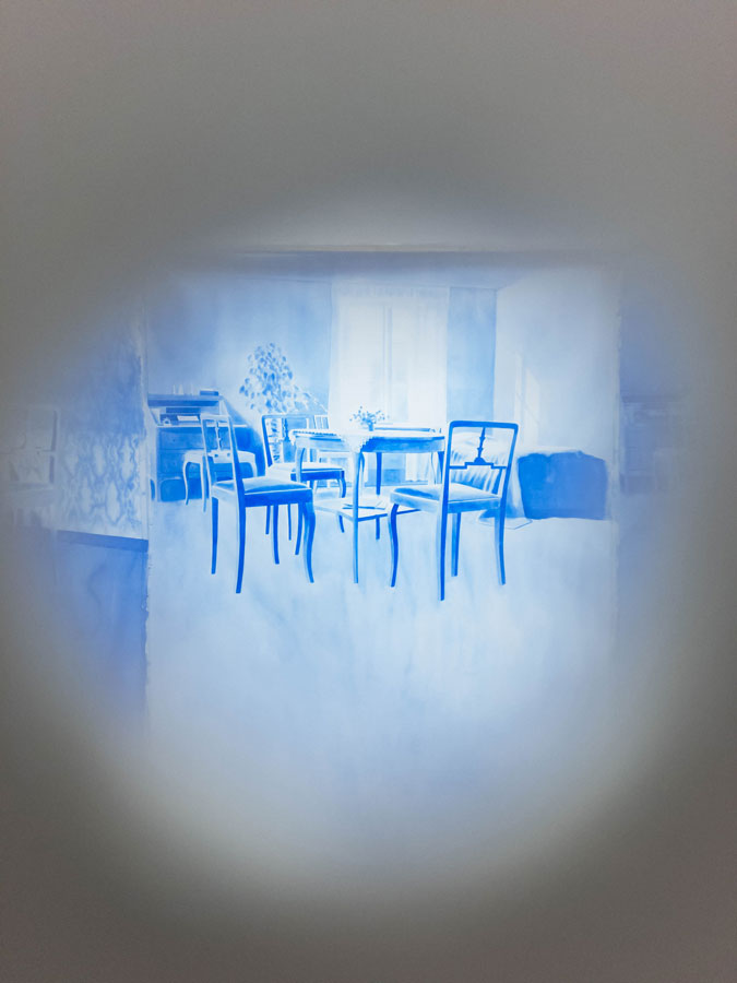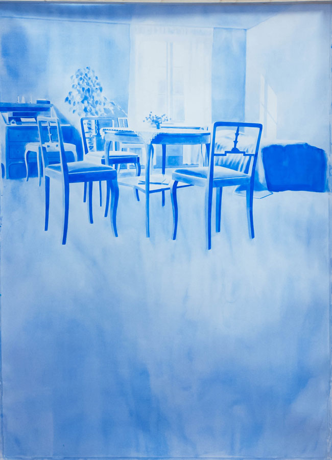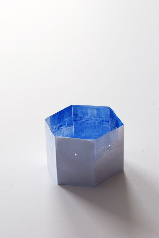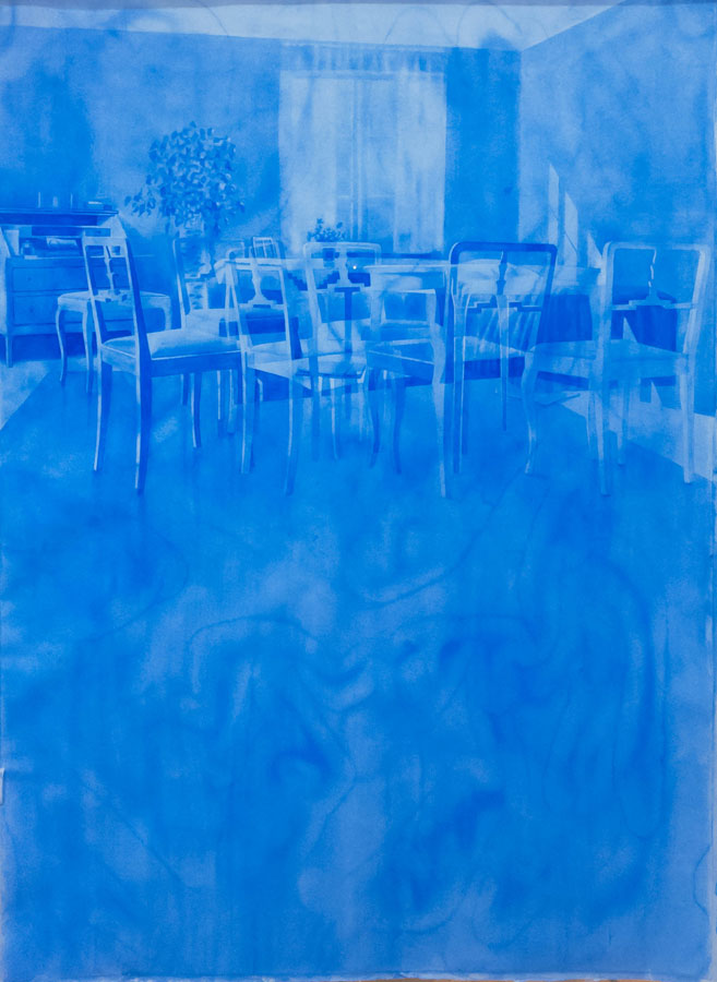Likt en fantomtecknare försöker Kristina Bength måla sin mammas minnen av hennes barndomshem i Hälsingland som 1974 brann ned. I en gruva, ett stenkast därifrån bröts kobolt, vars struktur på molekylnivå är hexagonal. I sex akvareller i koboltblått framträder olika versioner av ett rum som tillsammans bildar en hexagon. Målningens rum nås genom ett litet kikhål som även blir den motsatta målningens gränspunkt. Även måleriet vittnar om en flyktighet, där papprets neutrala yta blir genomlyst av kobolt, som en röntgenstrålning. Betraktarens perspektiv är begränsat, liksom minnet är som ett rum man inte kan komma åt annat än genom traderade fragment.